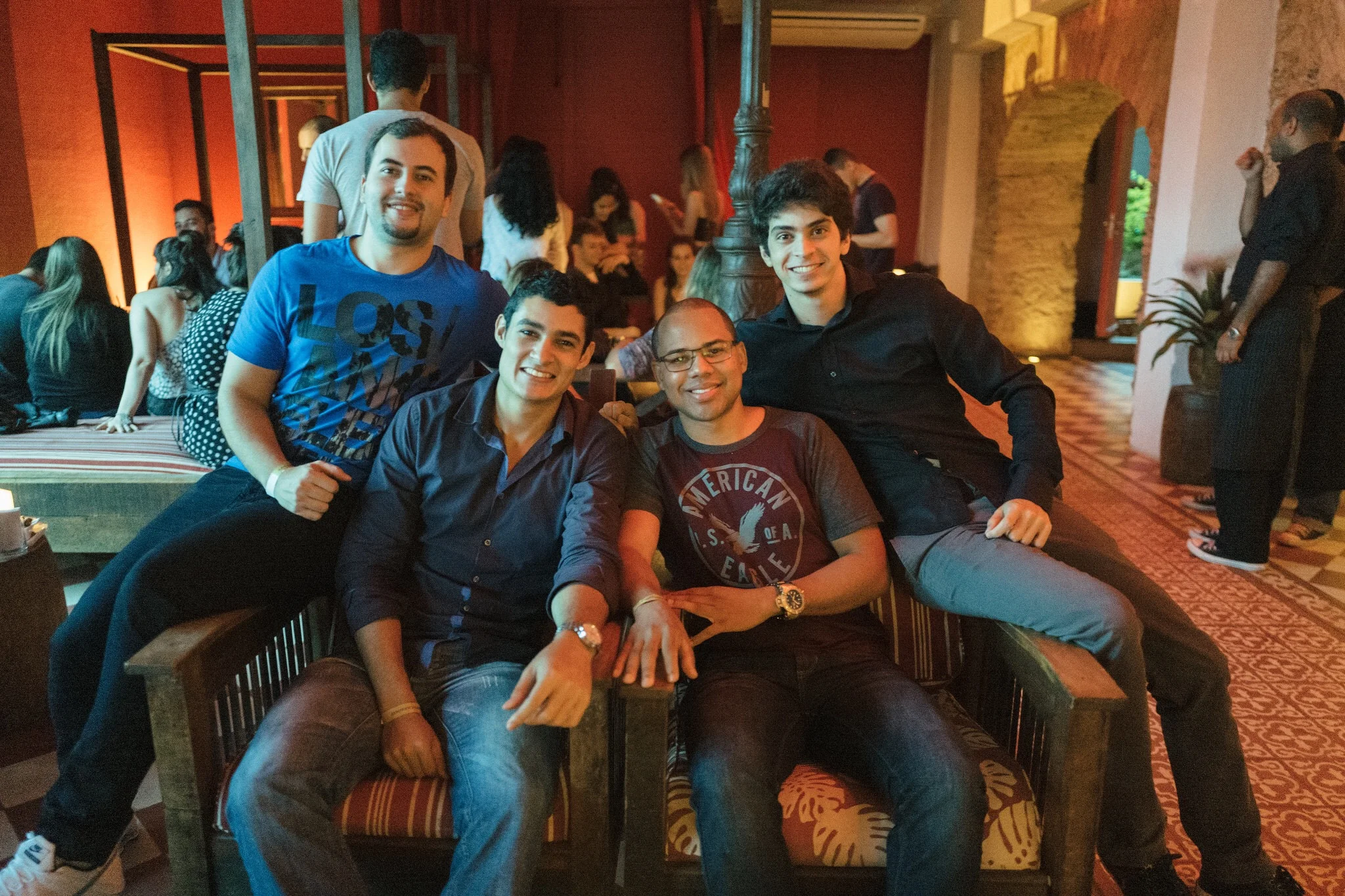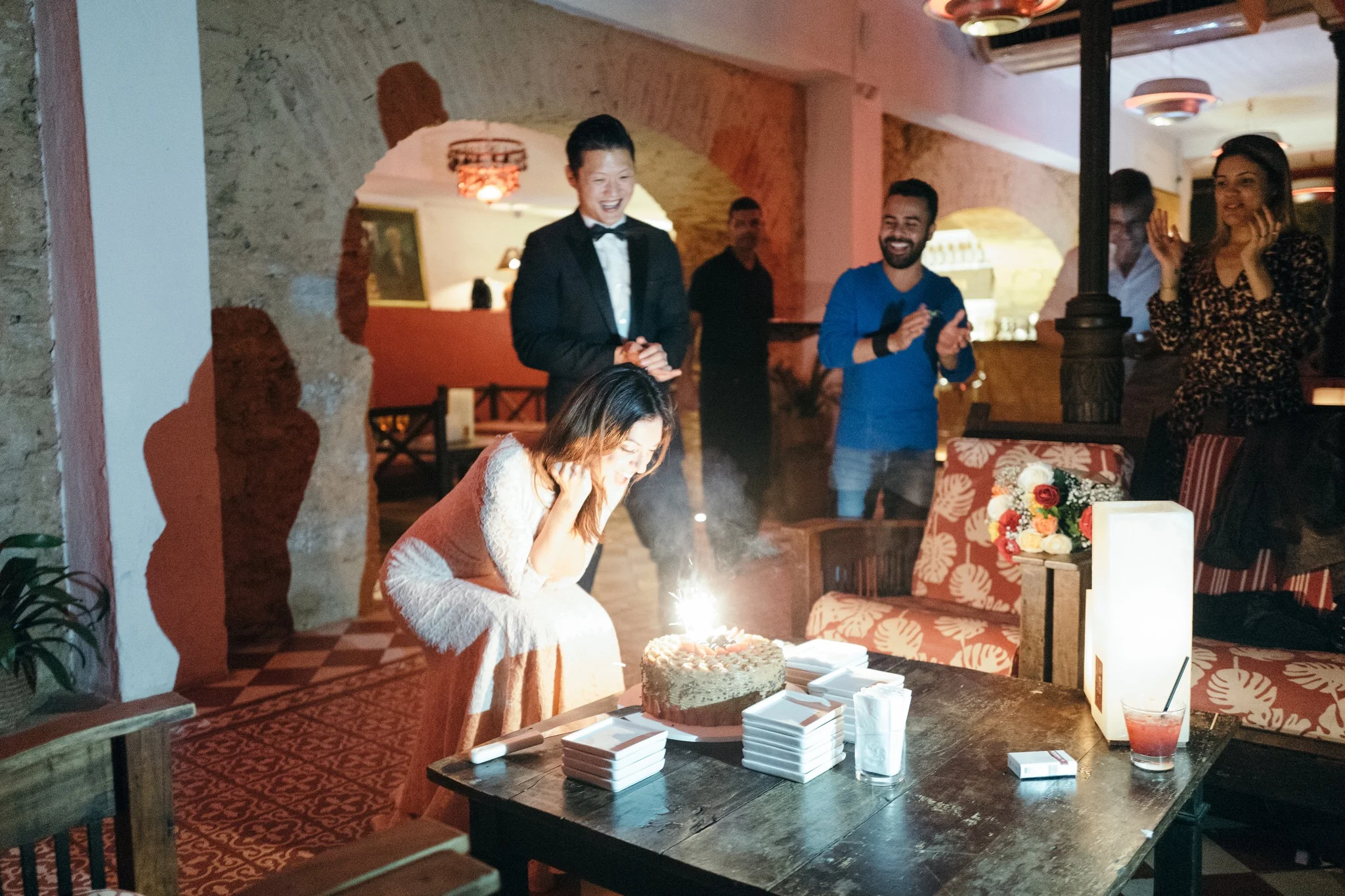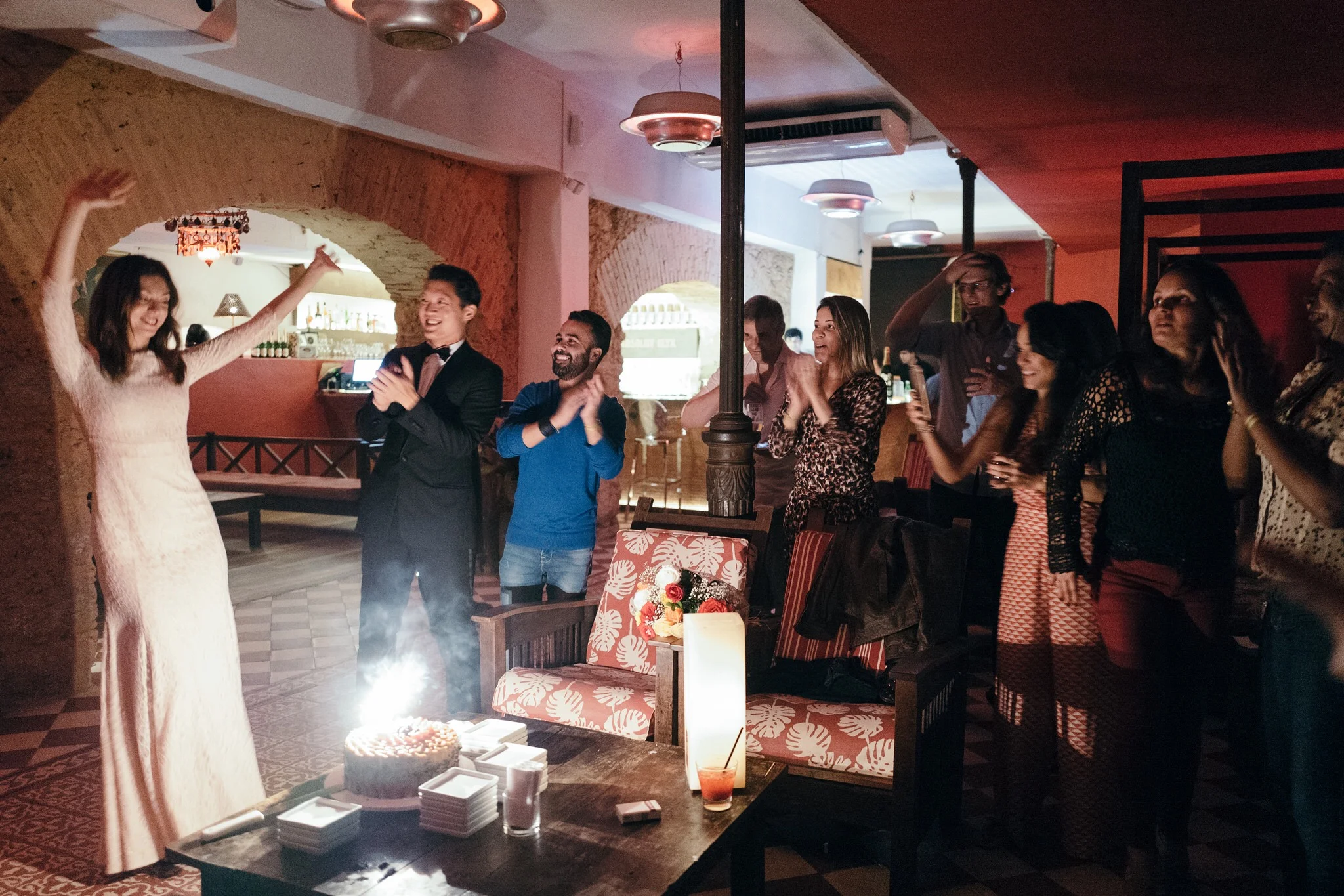 Como havia imaginado, retornamos para o hotel as 5:30 e em 20 minutos tomei banho e fiquei pronta pra sairmos. No entanto, o Andrew estava tranquilo e se arrumando sem pressa e acabei ficando esperando por ele. Eu não desconfiei de nada, e também havia um casamento acontecendo no hotel nesse mesmo horário, isso colaborou pra que eu não suspeitasse de nenhum detalhe envolvendo a festa que estavam preparando pra mim. Estava serenando levinho, passarinhos cantando no lindo jardim do hotel enquanto caminhávamos pra parte dos fundos pra supostamente pegar o carro e irmos pra Ipanema, onde fica o restaurante Gero, lugar onde achei que seria o jantar, mas de repente o Andrew me chamou pra ir no lounge do hotel, eu relutei por achar que a recepção do casamento estava acontecendo lá, mas ele insistiu e eu fui. Estava tão envergonhada, me sentindo a penetra da festa alheia. Caminhei adentro do espaço de cabeça baixa e indo em direção às paredes como quem se esconde, então ele segurou em minha cintura e gentilmente me virou para onde meus amigos estavam reunidos e com muitos sorrisos, fui calorosamente recebida por cada um.