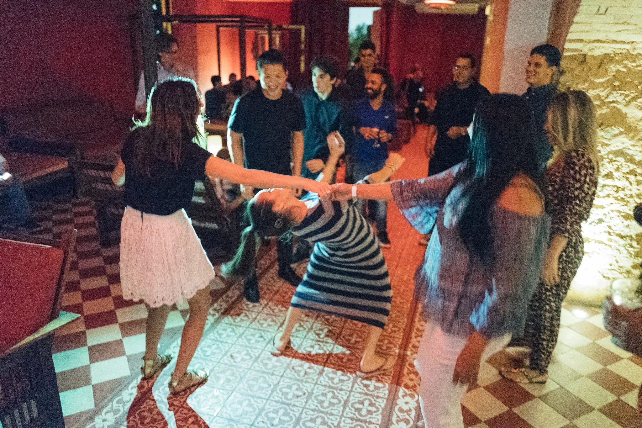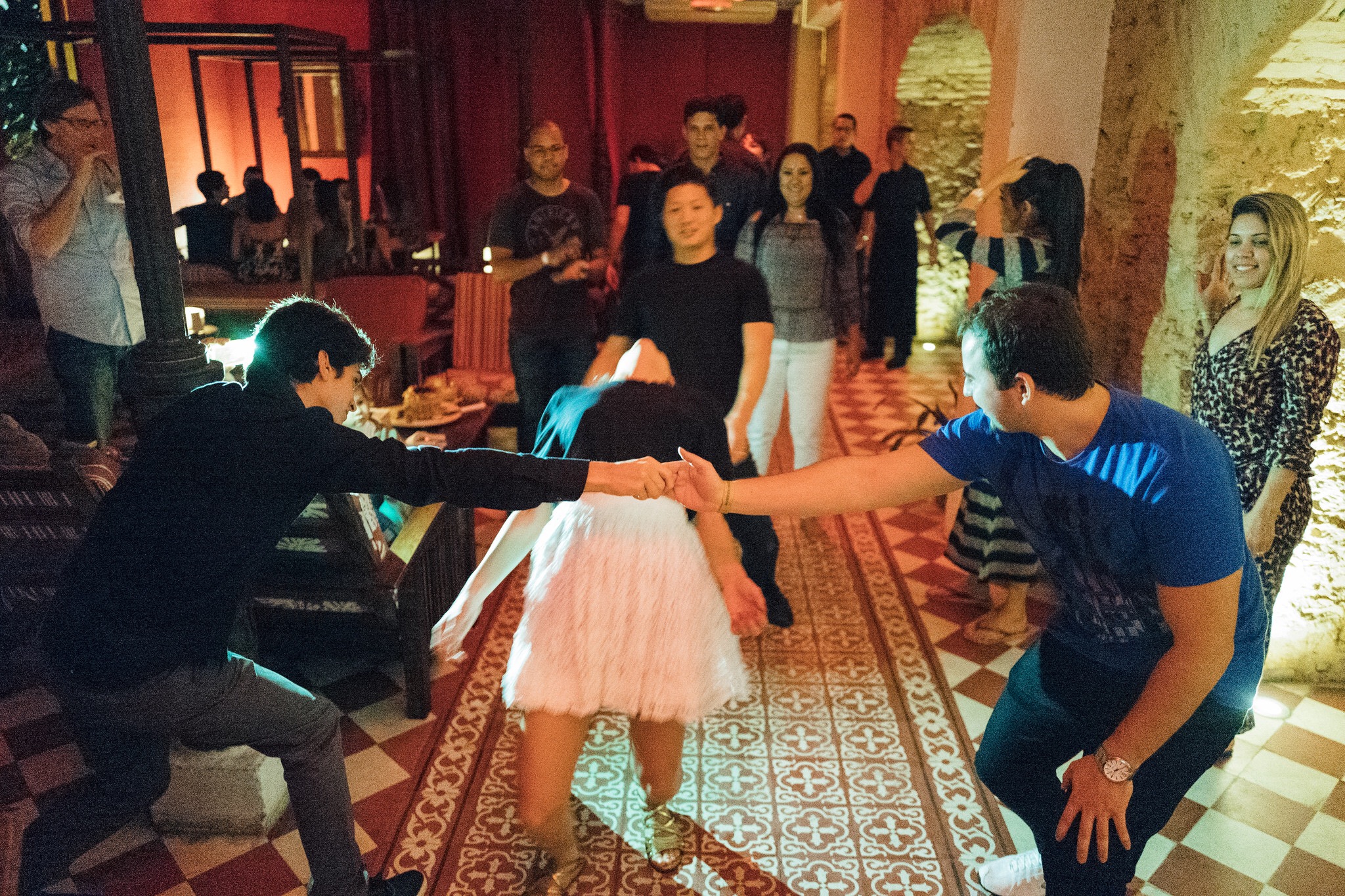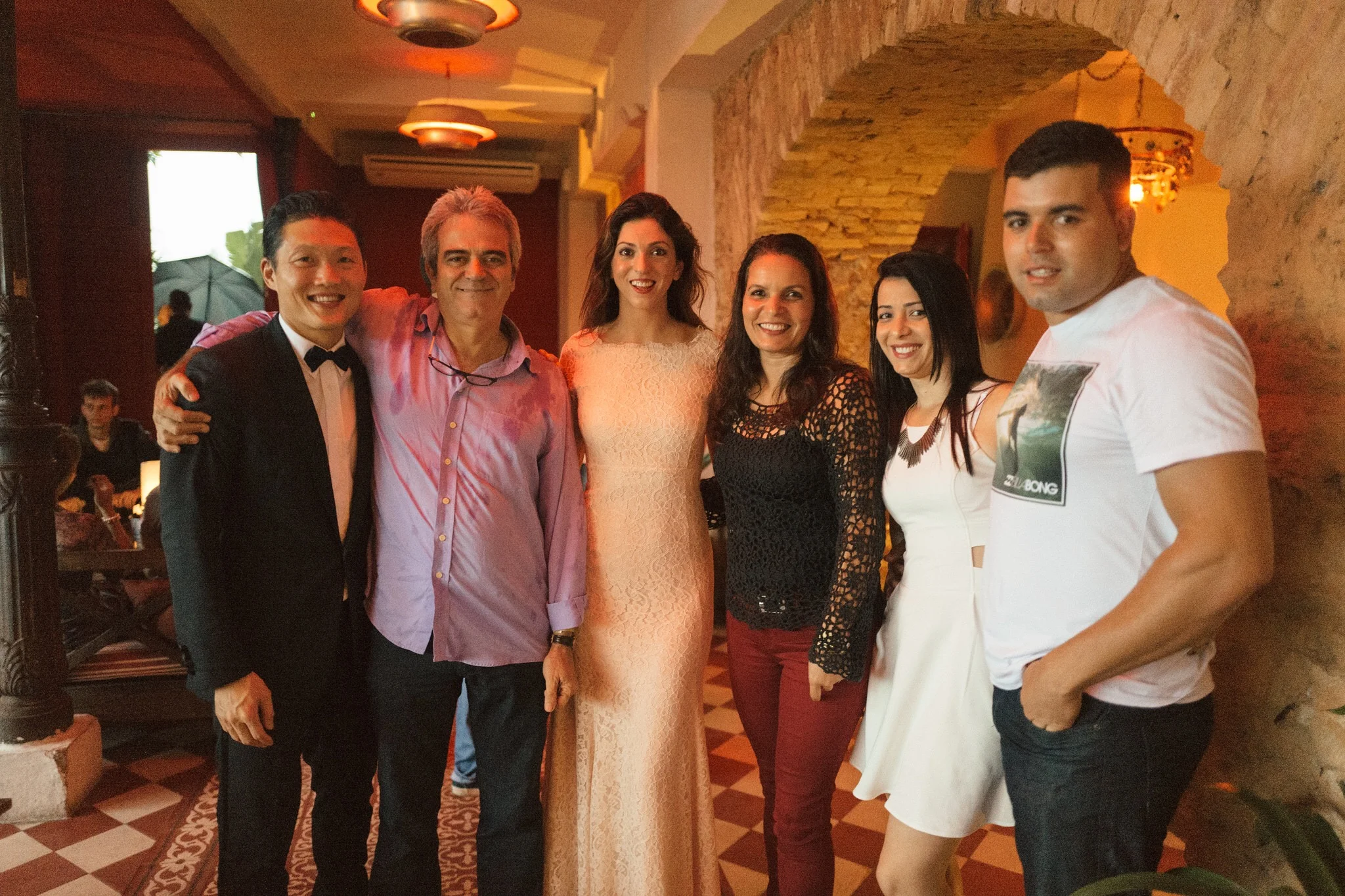 Como havia imaginado, retornamos para o hotel as 5:30 e em 20 minutos tomei banho e fiquei pronta pra sairmos. No entanto, o Andrew estava tranquilo e se arrumando sem pressa e acabei ficando esperando por ele. Eu não desconfiei de nada, e também havia um casamento acontecendo no hotel nesse mesmo horário, isso colaborou pra que eu não suspeitasse de nenhum detalhe envolvendo a festa que estavam preparando pra mim. Estava serenando levinho, passarinhos cantando no lindo jardim do hotel enquanto caminhávamos pra parte dos fundos pra supostamente pegar o carro e irmos pra Ipanema, onde fica o restaurante Gero, lugar onde achei que seria o jantar, mas de repente o Andrew me chamou pra ir no lounge do hotel, eu relutei por achar que a recepção do casamento estava acontecendo lá, mas ele insistiu e eu fui. Estava tão envergonhada, me sentindo a penetra da festa alheia. Caminhei adentro do espaço de cabeça baixa e indo em direção às paredes como quem se esconde, então ele segurou em minha cintura e gentilmente me virou para onde meus amigos estavam reunidos e com muitos sorrisos, fui calorosamente recebida por cada um.